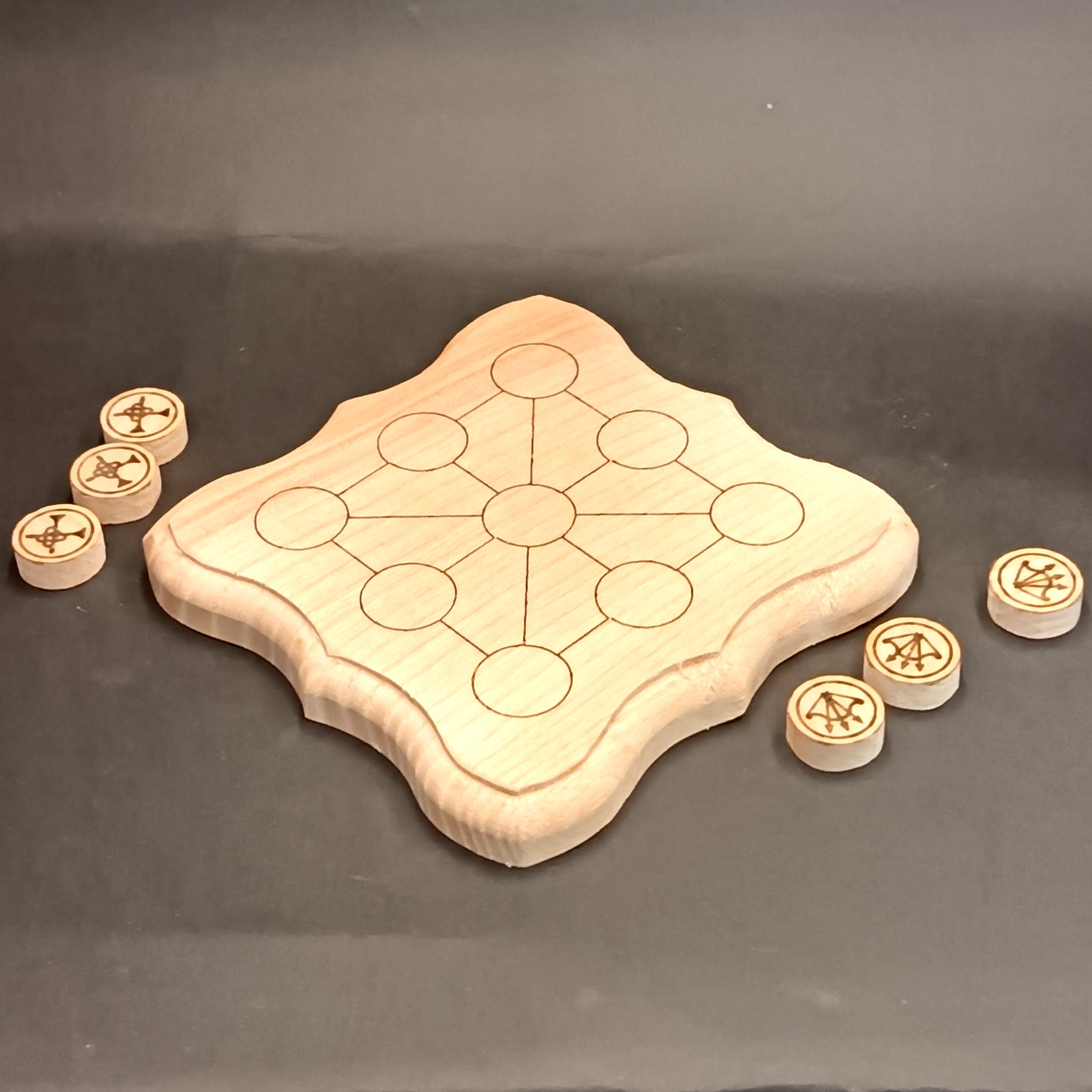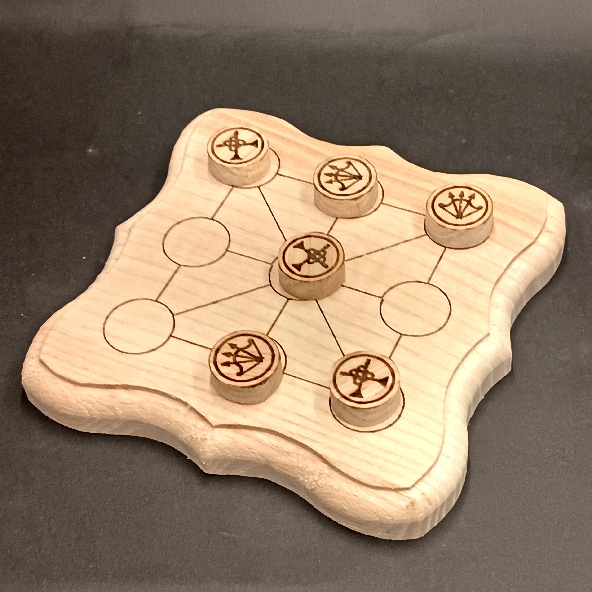 Plateau en frêne découpé à la main et gravé au laser, fournis avec 2 fois 3 méreaux (pions)